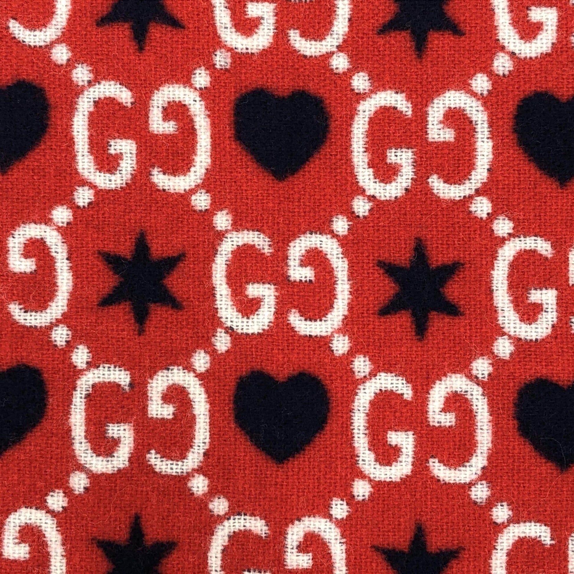 The scarf features the iconic GG pattern interwoven with charming heart motifs, adding a touch of whimsy to its sophisticated design. This versatile piece can effortlessly elevate any ensemble, whether draped over the shoulders for a chic evening look or wrapped snugly for a touch of luxury on a brisk day.