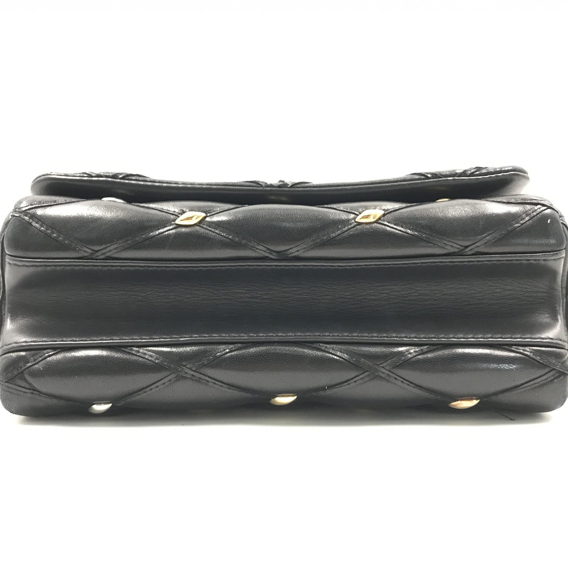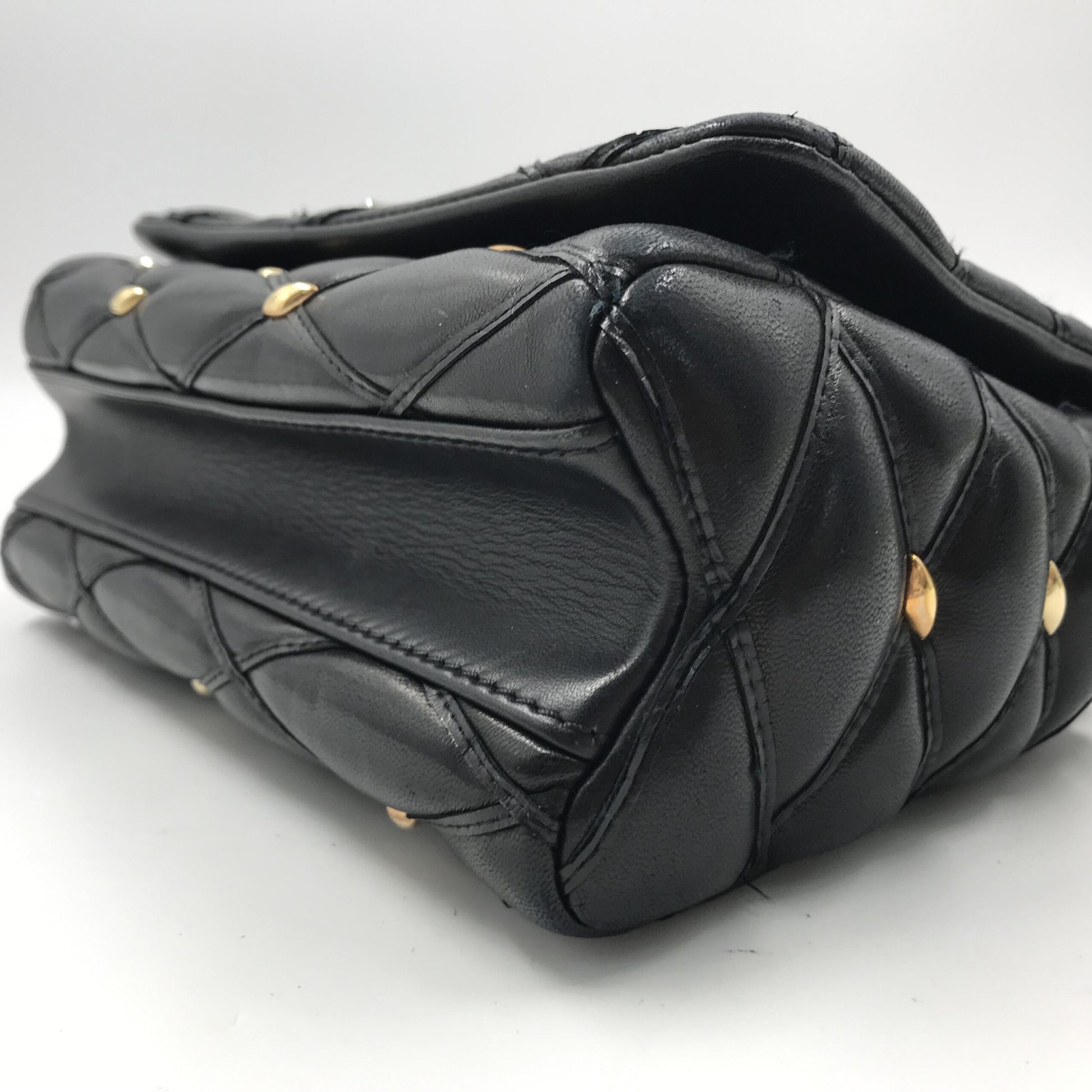The exterior of this bag features a striking quilted design adorned with studs, exuding a bold yet sophisticated allure. While there is minor rubbing on the corners and a few scratches, these subtle imperfections do not detract from its overall beauty and charm. The interior is immaculate, showing no visible signs of wear or use, ensuring a pristine experience for its new owner.